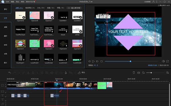2.内置了很多常用的素材,比如标题和字幕、滤镜和转场等。