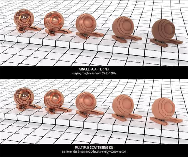 3.多重散射改善了无光泽表面的渲染,并且可以轻松设置所有灯光效果。