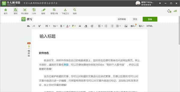360doc个人图书馆软件下载,智能图书管理工具,在这里不仅可以存储各种图书内容,还可以编辑个人文件,插入各种丰富的文字效果,360doc个人图书馆一键式排版效果,轻松导入各种数据,为你提供便捷的阅读模式,并节省更多的存储空间。