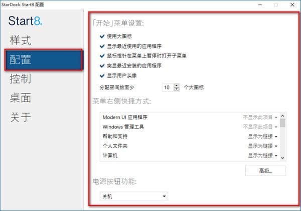 2.配置界面选择开始菜单设置和电源按钮功能。