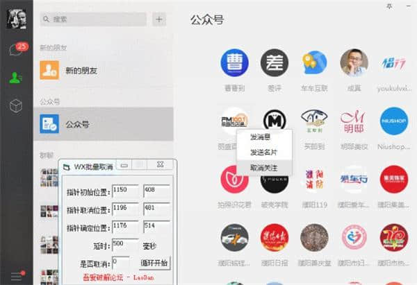 一键批量访问微信微信官方账号软件下载可用于批量访问微信关注的各类微信官方账号。一键批量取关微信公众号器软件下载可以让你轻松获得微信官方账号图标的位置,一键取消关注。各种操作方式更方便快捷,自动取消更方便,避免了那些烦人的广告。