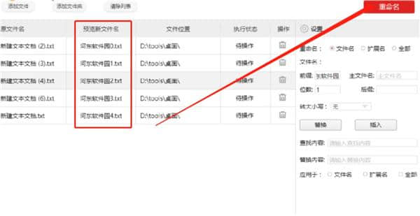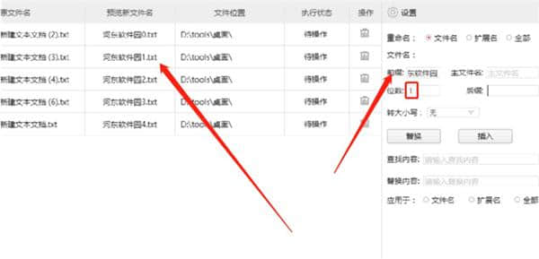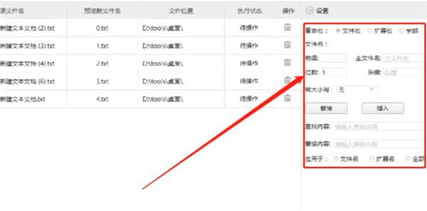 3.点击打开按钮后,我们选择的所有TXT文件将被加载到软件中。我们在右边的设置界面设置了一些重命名文件的规则,包括替换、插入等。,用户可以根据自己的需求进行选择。