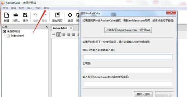 三、打开RocketCake软件,点击“帮助”找到“注册”,在安装包中输入授权密码。