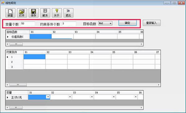 3.变量数50,约束数3,目标函数MAX,点击确定生成数据表。