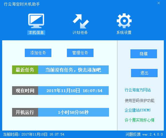 行云海定时关机助手软件下载,这个工具有非常方便的优势,而且它还为很多用户提供了很多辅助功能,定期提醒任务和事项,行云海定时关机助手让我们的办公事务有了一个非常好的计划,并且可以随时定期管理,带来简单实用的效果。