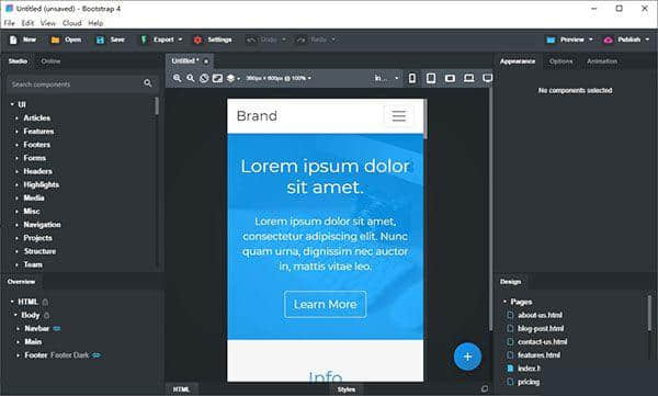 Bootstrap Studio软件下载,web前端框架建设设计服务工具,Bootstrap Studio(前端框架工具)可以为你带来一个功能更方便快捷的网站建设辅助工具。各种不同的网页内容都可以轻松管理,各种有趣的小工具都可以管理,使得网站建设的方式更加容易。