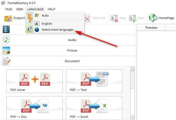 2.运行软件后,单击顶部的LANGUAGE,然后单击选择更多语言。