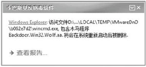 3.因为这个文件的名字包含win的样本,很可能和Windows有关,以免误删文件。现在,我们需要将“wincmd.exe”文件从目录转移到另一个分区,并准备使用防病毒软件进行初步分析。令人高兴的是,卡巴斯基禁止了这个文件,并给出了如图所示的提示框。