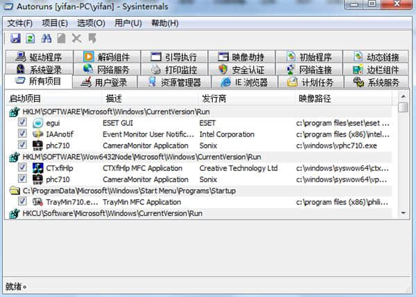 1.在本网站下载安装程序后,双击桌面上的“Autoruns”打开程序窗口,自动导航至“所有启动项”选项卡界面。