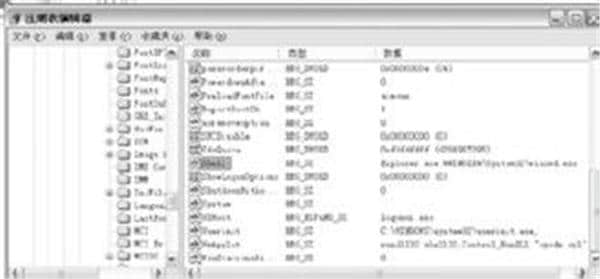5.win7在弹出的注册表编辑器窗口中,可以看到已经自动定位到分支的shell值,右侧的“Data”列显示结果。