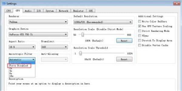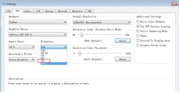 3.然后点击这里的gpu,可以看到有三个选项,分别是open gl null vulkan。三个最快的速度是vulkan,其次是OpenGL,null表示不用。如果你想跑得又快又平稳,选择这个vulkan。没错。但也要看游戏是否支持。不,换这个没用。