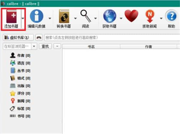 1.首先打开Calibre软件,如下图所示,点击红框中的“添加图书”图标。