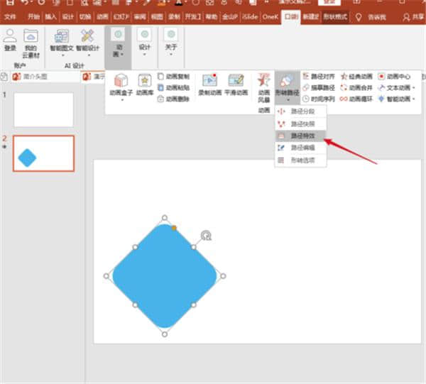 5.选择形状,然后单击口袋动画PA选项卡下动画菜单组中变换路径下的路径效果。