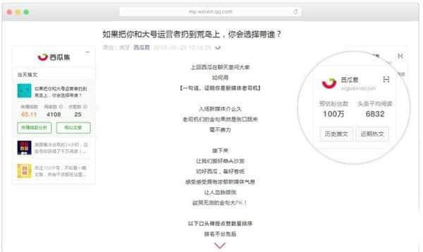 2.文章浏览页面右侧显示当前文章发帖微信官方账号的估计活跃粉丝数和平均头条阅读量。