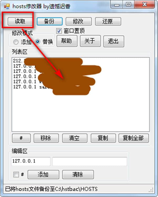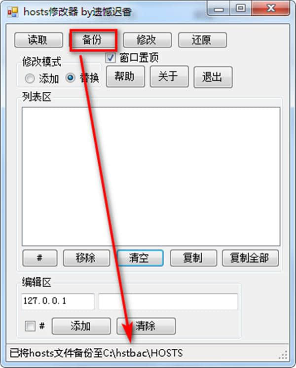 其次,最好在修改之前备份HOSTS文件的副本,然后单击“备份”。