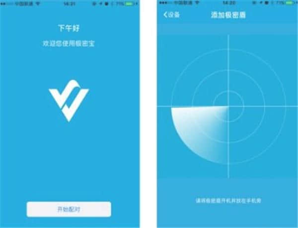 打开密盾,放在一边,启动极密宝并打开蓝牙,点击“开始配对”。
