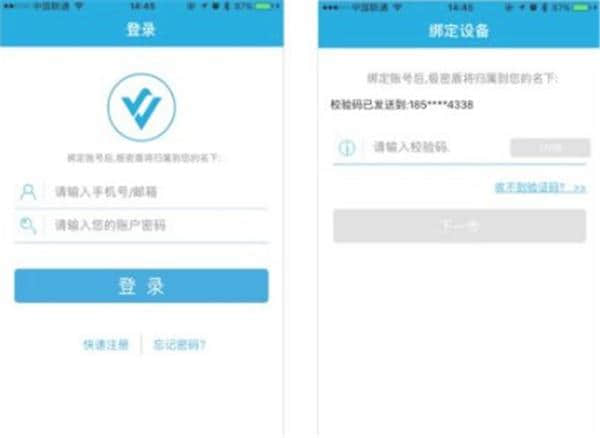 激活后,极密宝自动跳转到登录页面;如果没有密盾,点击“快速注册”;注册后,正确登录,通过短信/邮件验证码完成密盾绑定。
