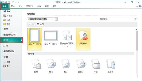 1.单击Publisher左上角的“文件”,在左侧菜单中单击“新建”。这时主窗口会出现各种可以使用的模板,需要使用任何模板的时候都可以直接点击。