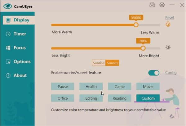 CareUEyes Pro软件下载,超好用的专业电脑屏幕蓝光护眼软件工具,/[k0/]护眼蓝光滤镜工具可以为你带来很多非常方便易用的蓝光护眼滤镜工具,让你不用担心每天盯着电脑屏幕造成的眼睛损伤和疲劳。在这里,各种蓝光滤镜功能可以有效保护眼睛,还可以调节电脑的色差和暗度,让眼睛更舒适。