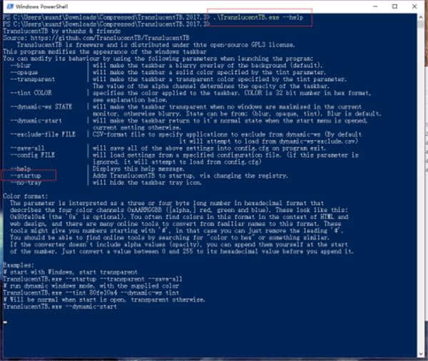 在命令窗口中,输入半透明TB.exe-help查看更多命令介绍。在这里,您可以使用tab键来完成,并通过直接输入半透明TB.exe-startup来启动命令。