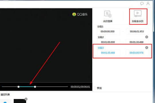 4.如果一个段落中的水印随着时间的变化而变化,或者如果你想清除字幕,你也可以点击“分段水印”选项来添加多个分段。每段的起止时间在右侧列表中,进度条中会显示大概的时间范围,如下图所示: