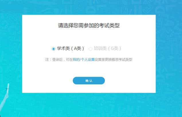 2.请选择您需要参加的考试类型、学术(A)和培训(G)。注意:登录后可以在我的/个人设置中更改雅思考试类型。