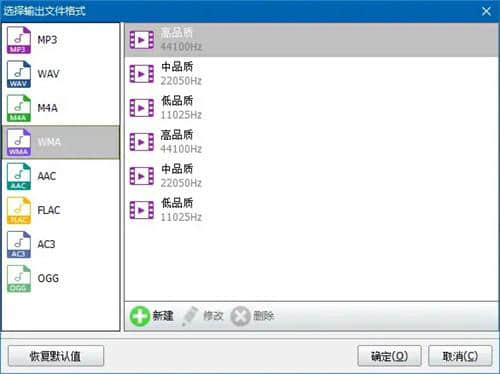 选择界面左侧的“目标格式”。该软件支持的目标格式包括MP3、WAV、M4A、WMA、AAC、FLAC、AC3、OGG等。单击选择格式,保存的音频文件质量选项会自动列在右侧。每种格式都预设有多种质量可供选择,并且可以同时自定义新的音频质量。界面如下图所示: