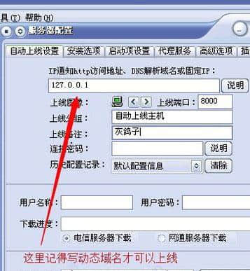 2.在配置界面,记得在配置中写在线域名或IP。在这里,你需要写动态域名,然后才能上线。