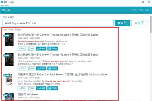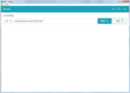 33台词免费版免费下载是应用软件的一款让你可以通过台词轻松搜索影片电脑软件,创佳软件园小编接下来针对33台词软件作一番介绍,需要这款33台词v0.2.1软件的朋友们,欢迎跟小编一起了解一下这个软件有什么不同吧!快来下载吧。