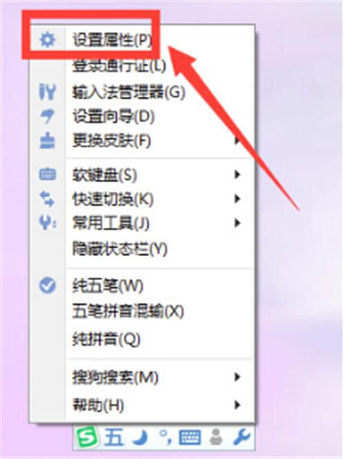 1.首先,切换到搜狗五笔输入法。您可以打开设置面板,通过右键单击状态栏中的[设置属性]来设置搜狗五笔输入法的候选单词数。