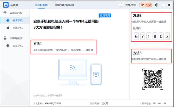 安装的快投屏软件在安卓和电脑上打开后,在两台设备的页面上都可以看到三种无线投屏方式。首先是自动搜索;二是在电脑中输入屏幕代码;三是用快投屏APP扫描电脑端二维码进行投影。(下图为电脑快投屏软件截图)