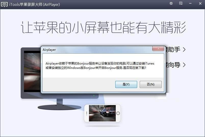 2.将会打开一个提示窗口。AirPlay依靠苹果的Bonjour服务让设备发现...在这种情况下,选择“是”