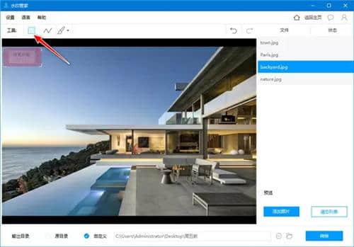 2.选中图片,点击矩形框选择工具,用鼠标从预览窗口框中选择需要去除水印的区域,拖拽移动框选择区域的位置。如果要取消选框,可以点击区域右上角的“X”按钮删除该区域。此外,该软件的VIP用户可以一次框定多个区域,批量去除图像水印。