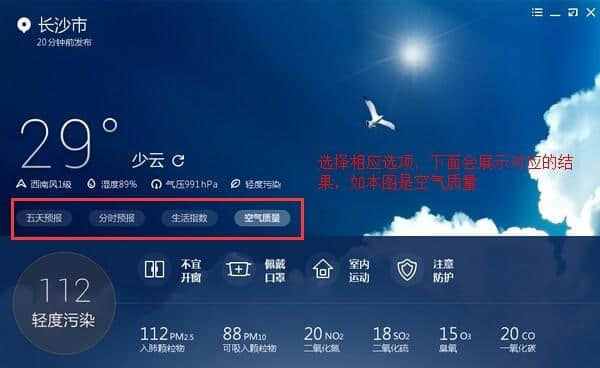 4.点击五天预报、分时预报、生命指数、空气质量等选项,相应的结果会直接显示在下方。
