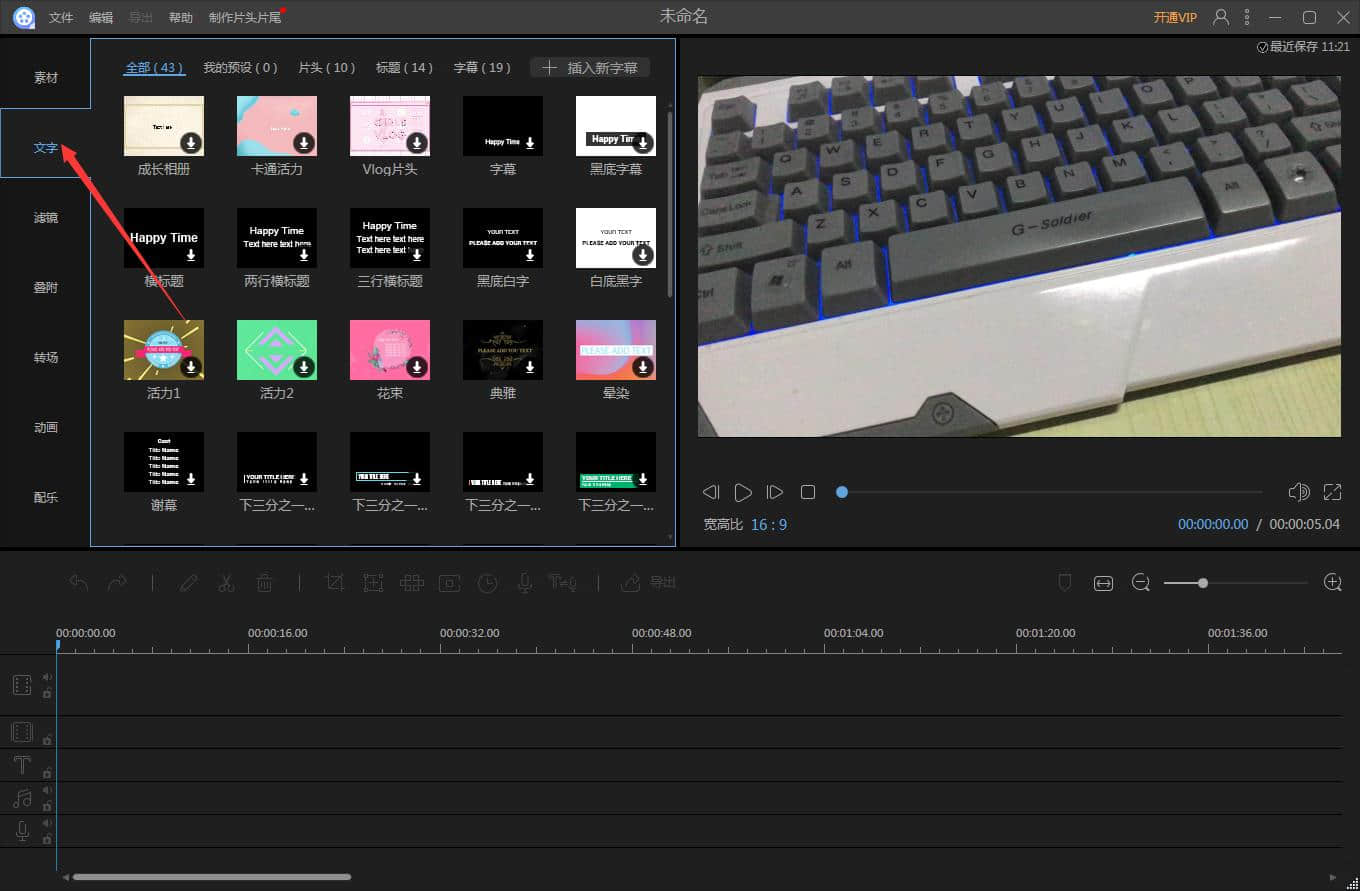 4.文本界面,选择您想要使用的文本样式,将其拖到时间线中的文本轨道,或者右键单击文本样式并“添加到轨道”以将效果应用到您的文本。