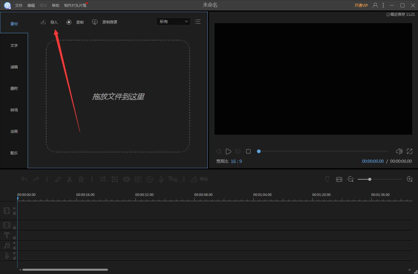 进入软件后,选择合适的宽高比,然后点击顶部的“导入”选项导入带字幕的文件,将文件拖到底部的时间轴上,让用户在播放窗口查看整体播放效果,然后开始添加所需字幕。