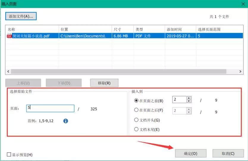 5.接下来,在福昕高级PDF编辑器中弹出的插入页面的设置中,用户设置要合并的PDF的具体显示位置,设置完成后,点击确定。