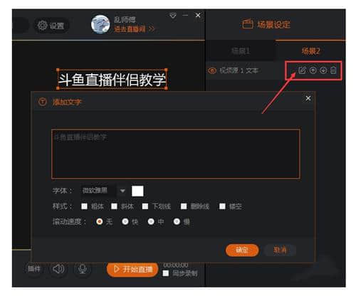 3.点击斗鱼直播伴侣右边的小方块,打开场景设置,更改场景设置(直播内容