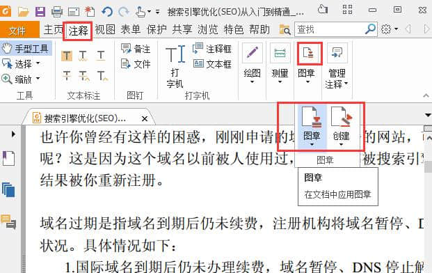 1.打开福信PDF阅读器后,点击菜单栏中的【评论】,点击【戳】,会弹出两个选项:戳:使用已有戳;创建:自己创建一张邮票,可以自己选择。