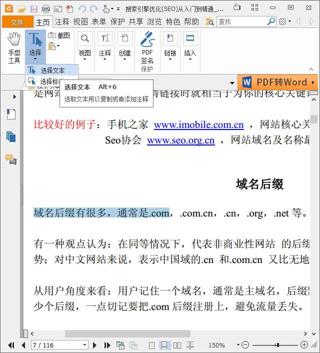 2.如果要使用PDF文件中的汉字,可以打开PDF文件,点击福信PDF阅读器工具栏中的【选择】,选择【选择文字】选项。