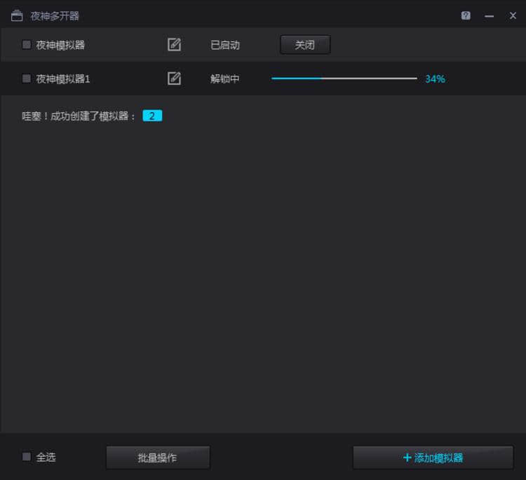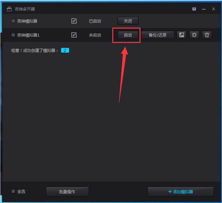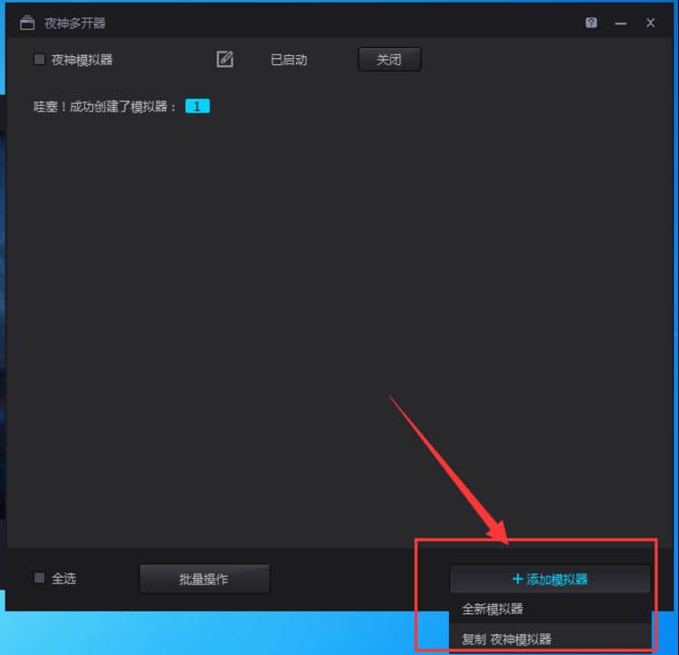 5.打开后,点击弹出的“夜神多开门器”窗口右下角的“添加模拟器”。点击后,它会让我们选择是打开全新的模拟器还是选择以前的模拟器,我们可以根据自己的需要进行选择。添加成功后会提示,如下图所示: