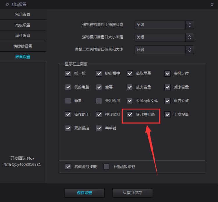 4.在设置界面设置后,点击“保存设置”按钮,返回主界面,在噩梦安卓模拟器右侧的功能列表中看到“多开模拟器”功能。
