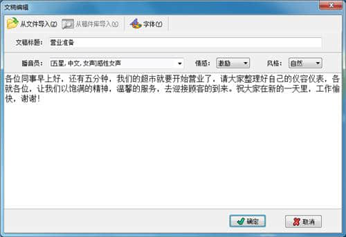 “文字转语音全能王”集成了第五代最新实景文字播音员。最新的播音员有播报情绪和播报风格的调整,使得发音更加流畅自然,堪比专业主持人。同时,新播音员是专门为现场广播设计的,其发音更响亮,是传统朗读播音员的两倍多。可以轻松应对嘈杂的环境,不会出现宣传内容听不清的尴尬情况。