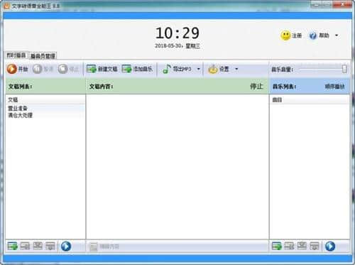软件中加入了文字内容和背景音乐,开始播放吧。点击左上角播放控制区的“开始”按钮,开始播放语音和背景音乐。声音会连续循环播放,音乐会无序或无序播放。在播放过程中,您也可以点按“暂停”或“停止”按钮来暂停或停止播放。