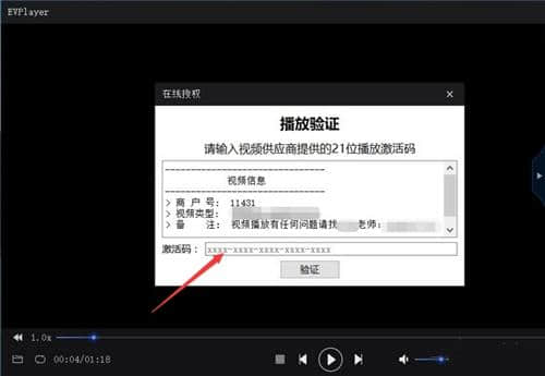 3.重启EVplayer后,打开它,将上一步的授权码粘贴到框中。