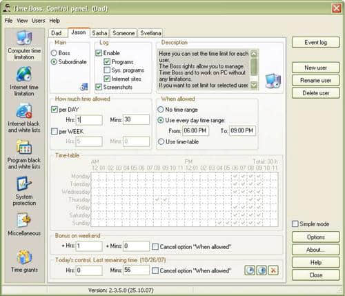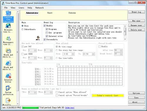 Time Boss是一款时间控制软件工具,帮助Time Boss的用户轻松了解某一时刻的运行时间,随时提供一个事件的真实记录。Time Boss可以在有限的时间内指定某个程序的在线启动,同时还支持多种不同的语言,让其在电脑中得到快速流畅的运行。