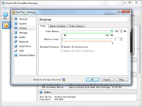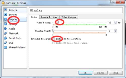 8.将“视频内存大小”设置为最大,勾选“启用3D加速”,记得保存;