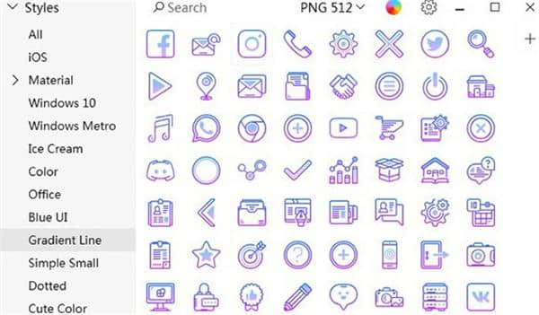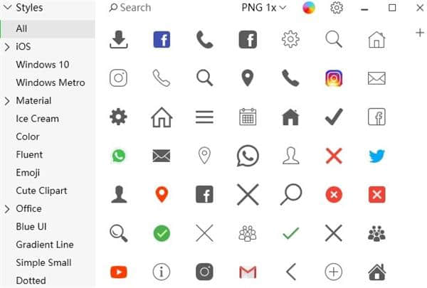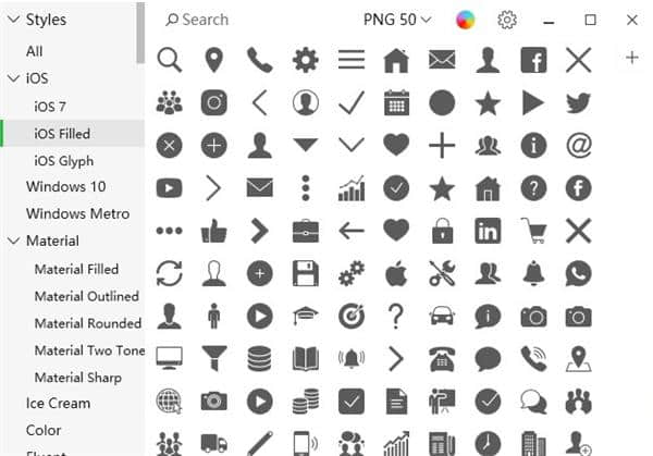 使用搜索栏查找所需的图标,或者使用左侧面板按样式和类别搜索图标。