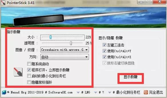 1.打开软件看到PointerStick的设置界面,其实就是主界面。您可以调整大小、透明度、形状、方向等。
