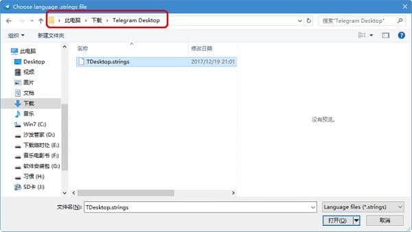 4.此时,计算机的“下载”文件夹将自动打开,找到文件TDesktop.strings并单击“打开”